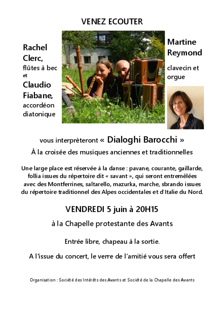 Rachel Clerc, flûtes à bec, Claudio Fiabane, accordéon diatonique et Martine Reymond, clavecin et orgue interprèteront « Dialoghi Barocchi ». À la croisée des musiques anciennes et traditionnelles.