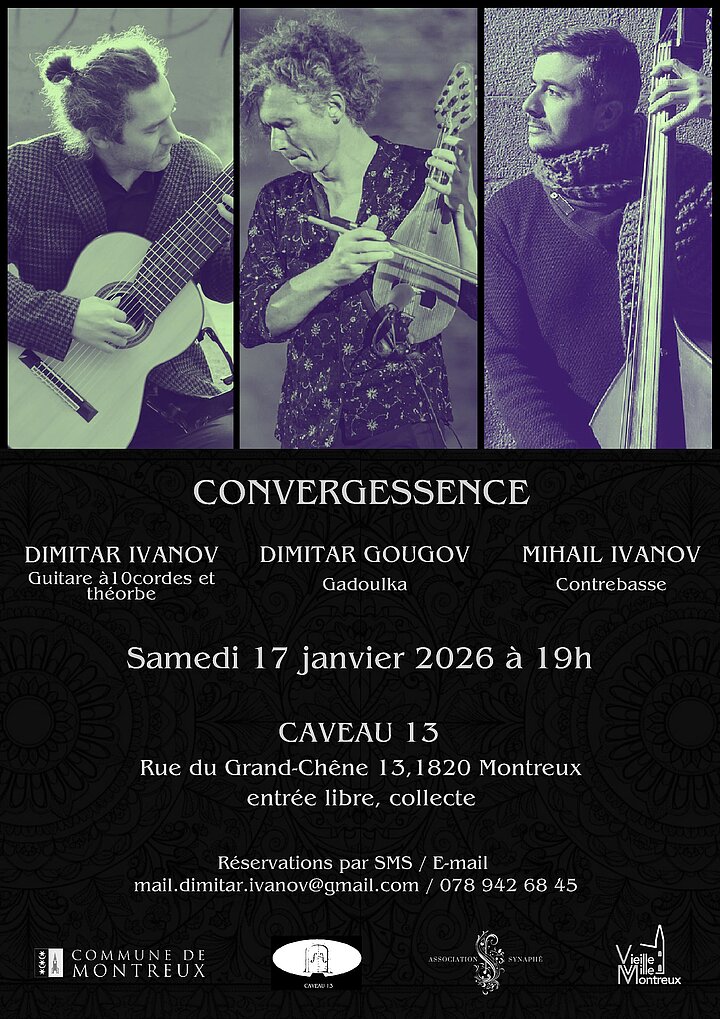 "Convergessence" est une fusion des mots convergence (croisement) et essence (origine). Pour ce projet, un nouveau répertoire est choisi, composé, arrangé et improvisé pour la guitare à 10 cordes ou le théorbe par Dimitar Ivanov d’une part, la gadoulka par Dimitar Gougov, et la contrebasse par Mihail Ivanov. Le trio propose une synthèse des musiques provenant de leur origine, dans l’expression du style classique contemporain, exécutée avec la liberté du jazz et portant une sonorité délicate de leurs instruments tout à cordes.