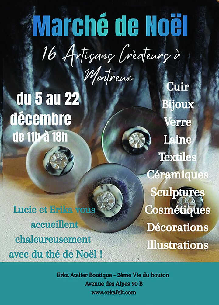 L'Atelier boutique d'Erika (Erka Créations laine feutrée) et Lucie (Bijoux fous - la 2ème Vie du bouton) accueillent les oeuvres d'artisans créateurs romands. Cuir, bois, verre, bijoux, laine, textiles, céramiques, sculptures, luminaires, décorations, illustrations, cosmétiques, une EXPO de qualité où se côtoient des objets déco pour de petits cadeaux et de magnifiques sculptures ou luminaires pour des coups de coeur. Venez découvrir un artisanat d'art de la région dans un lieu charmant à 2 pas de la gare où vous serez accueilli chaleureusement tous les jours avec du thé de Noël et des biscuits.
