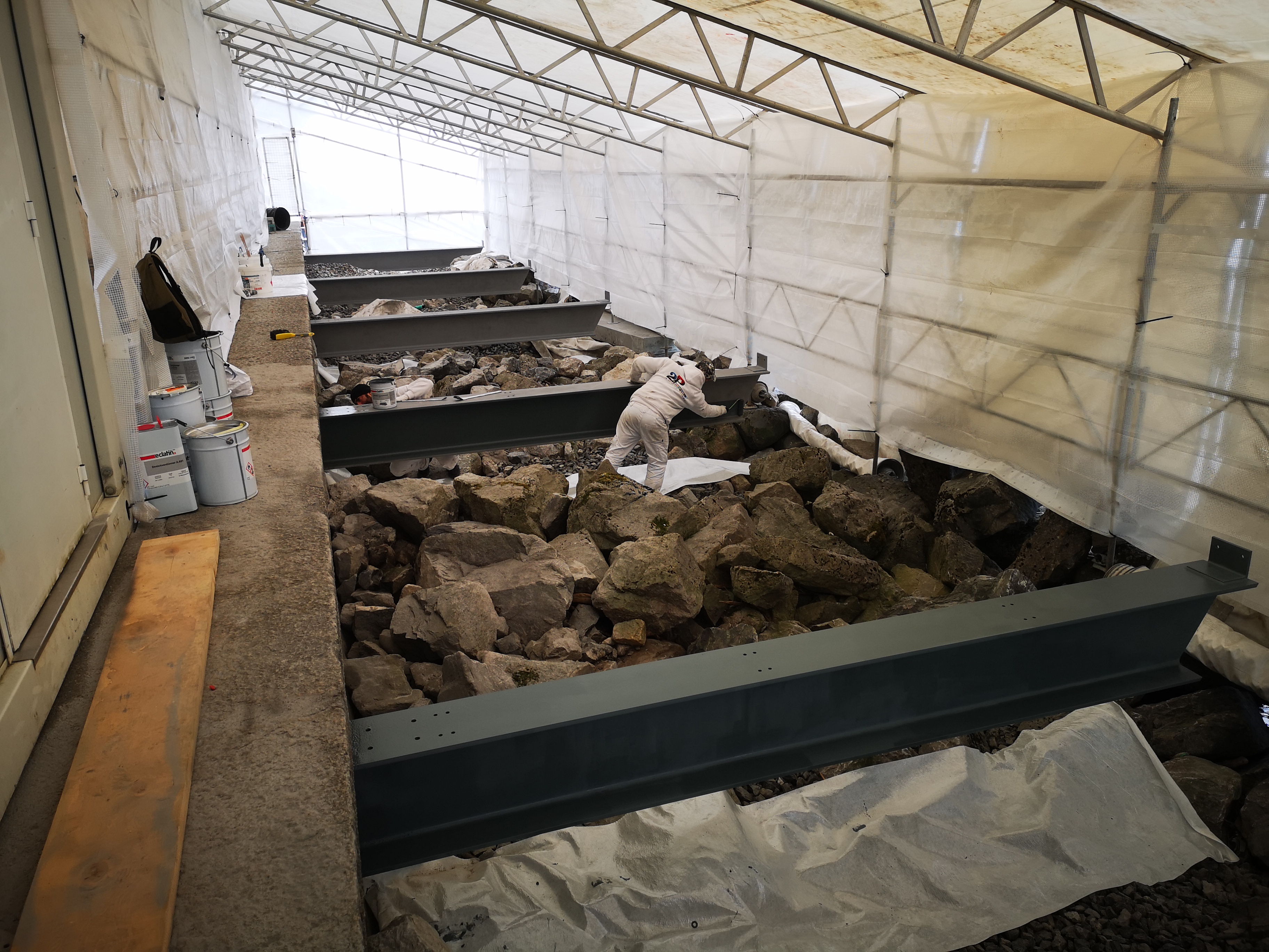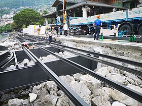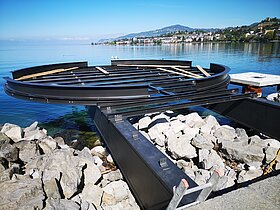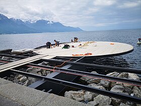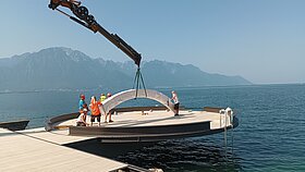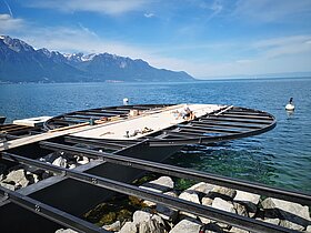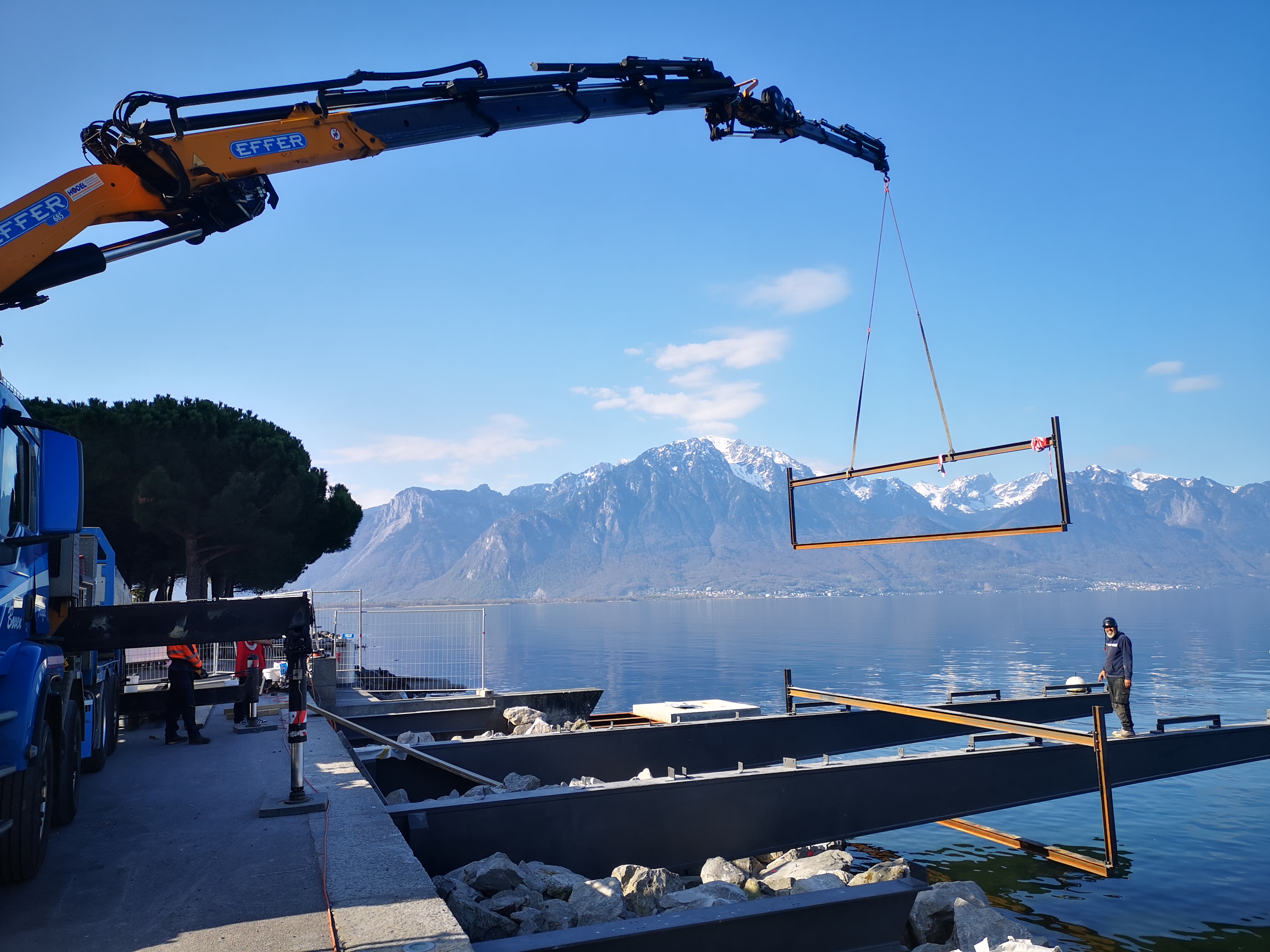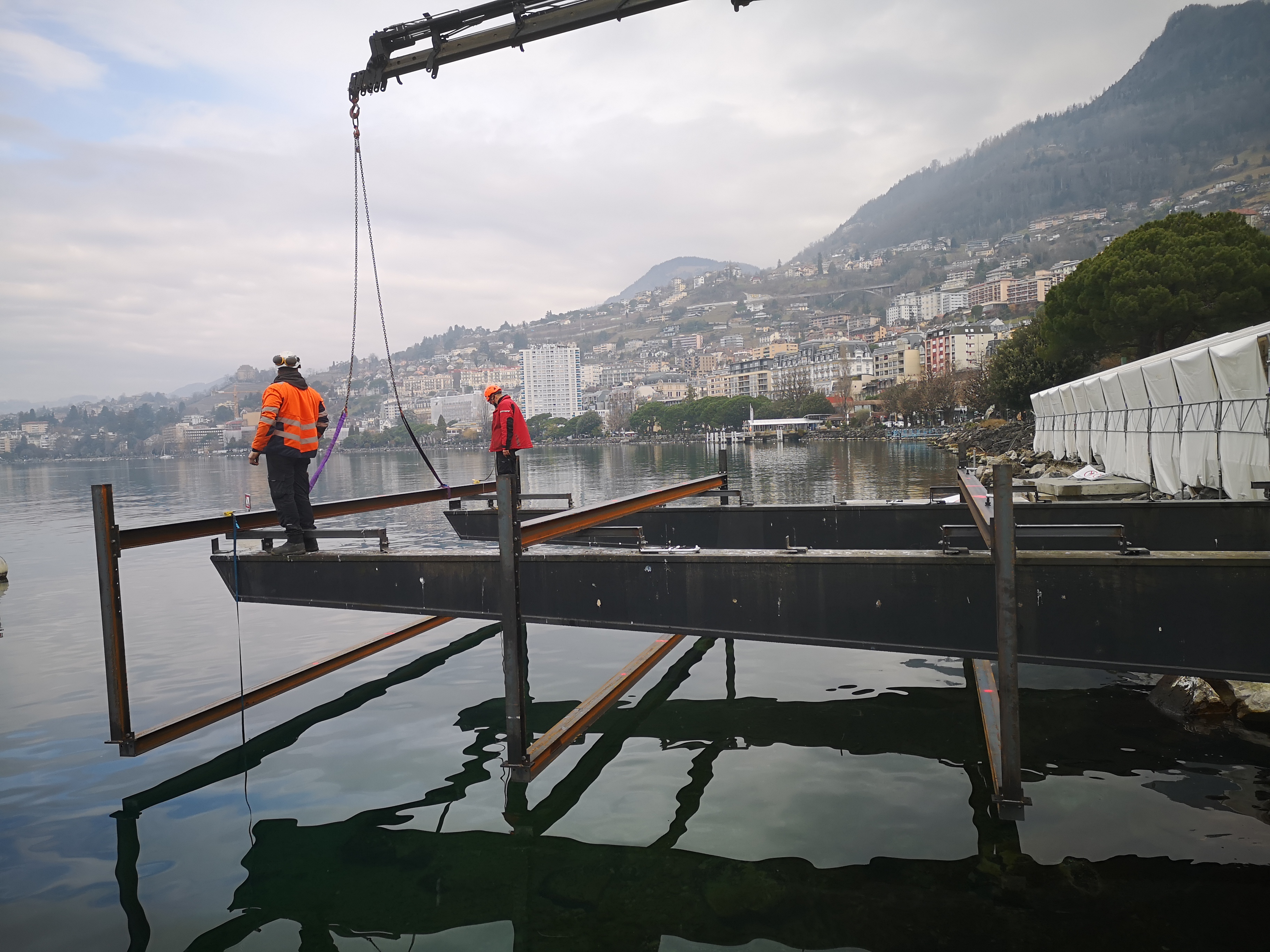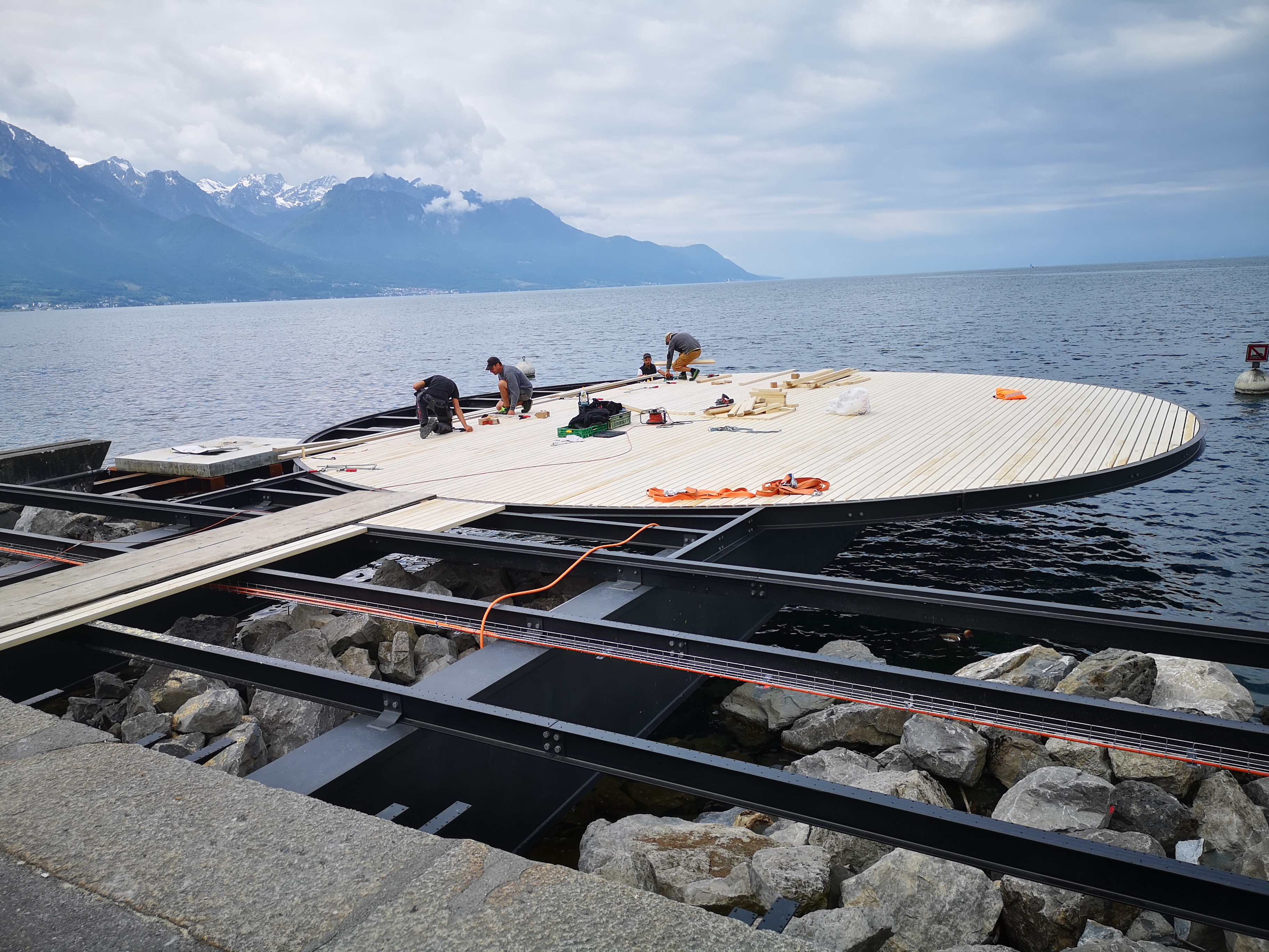 L’ouvrage, d’une surface totale de 305m2, dont une partie est suspendue au-dessus du lac, datait initialement de 2001. Il est doté d’une partie indémontable, composée de profilés porteurs qui ont dû être traités sur place grâce à des sas étanches, qui ont permis de préserver les éléments en métal de l’eau. Cette structure métallique est ancrée dans les quais à une distance entre 4 et 5m, à l’aide de gros socles en béton armé et des tirants d’ancrage dans le sol.