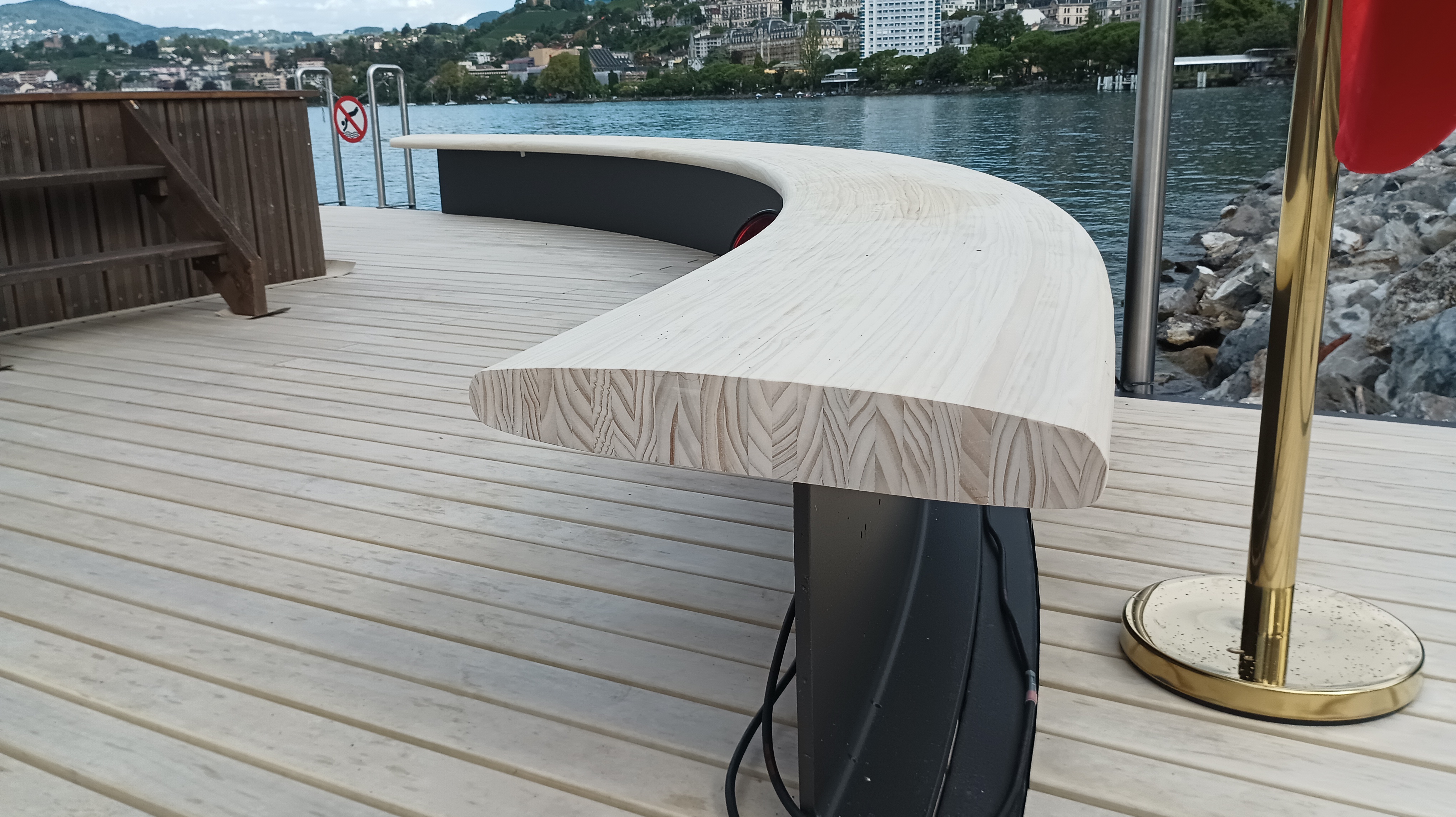 Sur le dessus, la superstructure démontable en métal, d’un poids d’environ 12 tonnes, a été démontée pour être traitée en usine. Le plancher et les bancs sont composés de bois massif Accoya®. Fabriqué à partir de pin radiata, celui-ci a subi un procédé de traitement par acétylation sans toxicité et respectueux de l’environnement. Par ailleurs, le bois utilisé est issu de forêts de plantation gérées de manière durable et à croissance rapide. 800 lames environ ont été nécessaires à la rénovation du plancher et des bancs, pour un poids total de 8.5 tonnes.